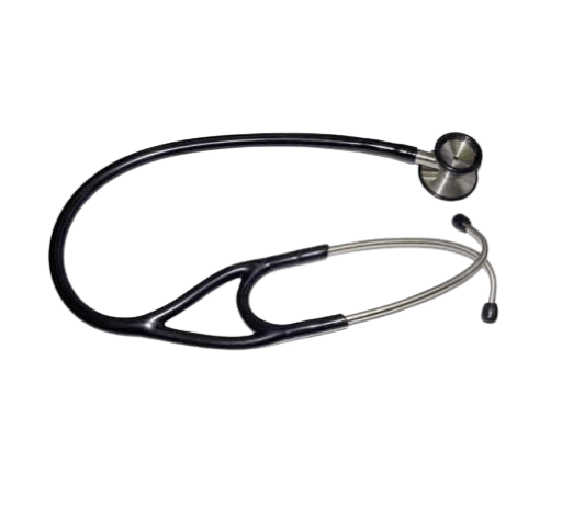 A double-headed cardiac stethoscope with stainless steel chest piece. The membrane and bell provide protection against cold rings, making auscultation as comfortable as possible.