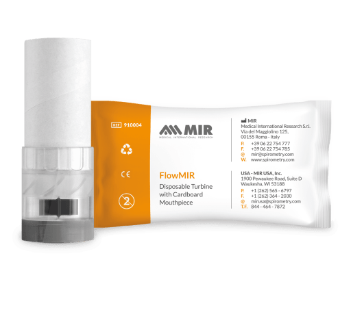 Disposable turbine flow meter, mono patient, factory calibrated, individually packed with cardboard mouthpiece.