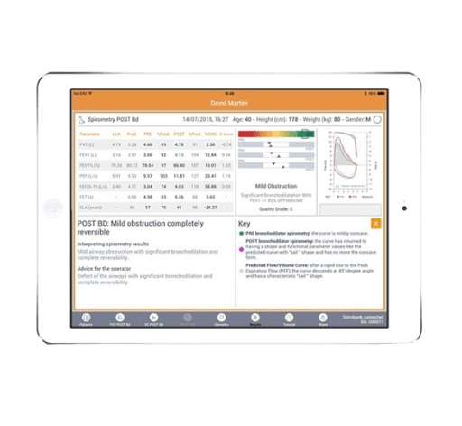 A mobile application (iOS and Android) enables real-time spirometry and oximetry tests on your iPad/iPad Mini/Android tablet. Designed for primary care health professionals, it is compatible with the Spirobank II Smart BLE spirometer, automatically connecting via Bluetooth Low Energy BLE 4.0. Data can be transferred in HL7 format for archiving or second opinions, with exclusive pediatric prompting to improve patient compliance.